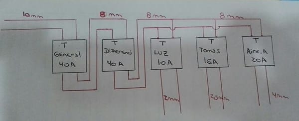 Y los cables que vayan debajo de un IGA de 40A tendrán que ser de (10mm2) (es decir el cableado del cuadro)