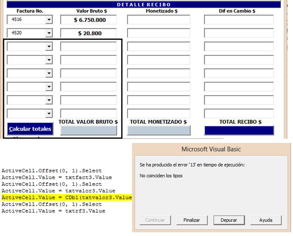 2) A la hora de dar clic en el botón guardar, si tengo algún dato vacío, saca error, es decir, me exige que debo llenar todos los campos donde tengo la función cdbl programada. (Anexo pantallazo).