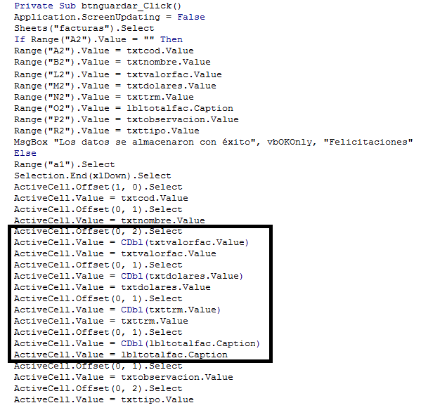 Resulta que tengo en un formulario varios valores numéricos que debo colocar en las celdas de la hoja, todos los datos están registrados en algunos textbox y unos cuantos labels, pero tengo un problema con ellos: