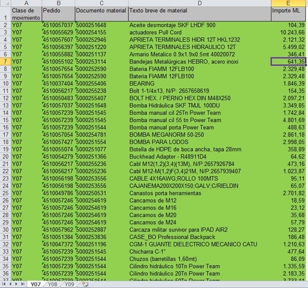 Espero haber explicado bien la situación y dejo un par de capturas. Mencionar que en algunos casos el Texto de material se repite complicando un poco el procedimiento ya que no existe codificación única.