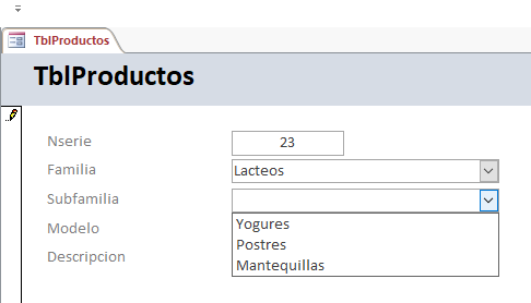Tengo una tabla de productos con los campos Familia y Subfamilia. Los productos los introduzco a través de un subformulario. ¿Cómo puedo poner para que el origen de los datos de la subfamilia los recoja de la familia de esa misma línea?