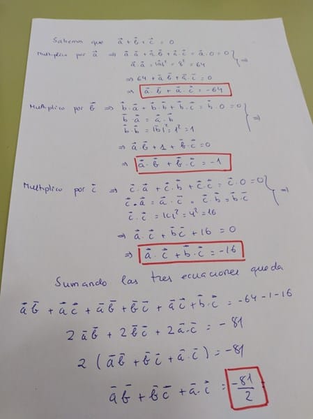 -Primero trazas el triangulo que forman los tres vectores: Esta cerrado, ya que dice que "La suma es cero". Te da tambien los modulos de esos vectores, asi que no te tiene que costar mucho trabajo determinar el valor de los tres angulos (recuerda que es un triangulo plano, y la suma de los angulos te dara 180 grados... con sacar dos, el tercero sale solo). Teniendo los angulos, calculas los SENOS de esos tres angulos.