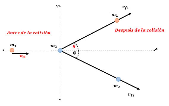 Una partícula A choca elásticamente con otra partícula de masa B que inicialmente está en reposo. La partícula A que impacta tiene una rapidez inicial de 4.30 m/s y hace una colisión oblicua con la partícula B, como muestra la Figura. Después de la colisión, la partícula A se aleja en un ángulo de 72.1° hacia la dirección de movimiento original y la partícula B se desvía a un ángulo ɸ con el mismo eje. Encuentre las magnitudes de velocidad finales de las dos partículas y el ángulo ɸ.