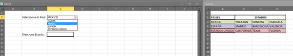 Logre realizar la lista desplegable en el Libro1 mostrando los países, pero no pude lograr que me mostrar los estados al seleccionar alguno de esos países.