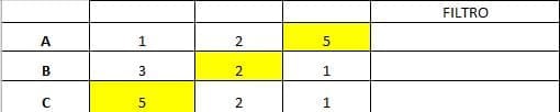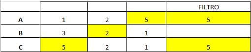 Quiero que en la columna FILTRO me ponga el contenido de toda la celda( incluido el color de la celda)de los números mayores que 4 de las filas A, B, C