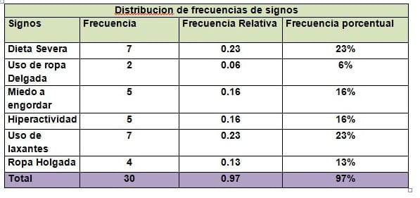 Durante el mes de abril del año 2016 se observó con sumo interés a 30 estudiantes con síntomas de anorexia, presentando los siguientes signos: dieta severa, uso de ropa delgada, miedo a engordar, dieta severa, hiperactividad, uso de laxantes, uso de ropa holgada, uso de laxantes, miedo a engordar, dieta severa, uso de ropa delgada, dieta severa, dieta severa, uso de laxantes, hiperactividad, hiperactividad, dieta severa, uso de laxantes, uso de ropa holgada, miedo a engordar, uso de ropa holgada, uso de laxantes, hiperactividad, dieta severa, miedo a engordar, uso de laxantes, uso de ropa holgada, uso de laxantes, miedo a engordar, hiperactividad.
