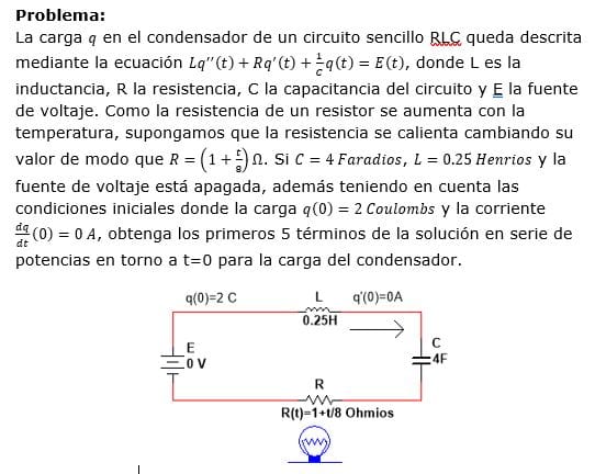 Se solicita obtener los primeros 5 términos de la solución en serie de potencias en torno a t=0 para la carga del condensador, adjunto imagen que describe el problema con claridad