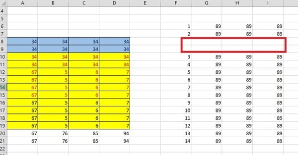 De esta pregunta como inserto fila sin afectar la columna F, G, H, I, es decir que no lo deja filas en blanco