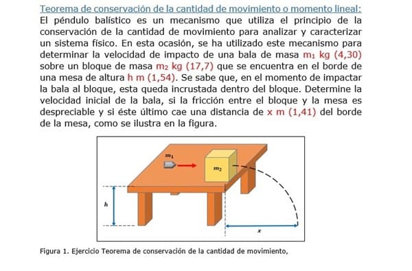 Teorema de conservación de la cantidad de movimiento o momento lineal: El péndulo balístico es un mecanismo que utiliza el principio de la conservación de la cantidad de movimiento para analizar y caracterizar un sistema físico. En esta ocasión, se ha utilizado este mecanismo para determinar la velocidad de impacto de una bala de masa m1 kg (4,30) sobre un bloque de masa m2 kg (17,7) que se encuentra en el borde de una mesa de altura h m (1,54). Se sabe que, en el momento de impactar la bala al bloque, esta queda incrustada dentro del bloque. Determine la velocidad inicial de la bala, si la fricción entre el bloque y la mesa es despreciable y si éste último cae una distancia de x m (1,41) del borde de la mesa, como se ilustra en la figura.