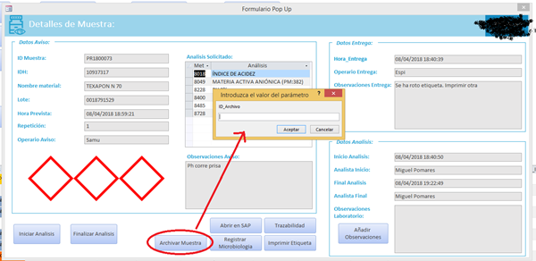 Este proceso se hace desde un botón en un formulario de visualización de la muestra, que es de donde coge el dato ID_Muestra