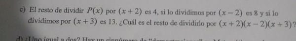 El resto de dividir P(x) por (x+2) es 4, si lo dividimos por (x-2) es 8 y si lo dividimos por (x+3) es 13