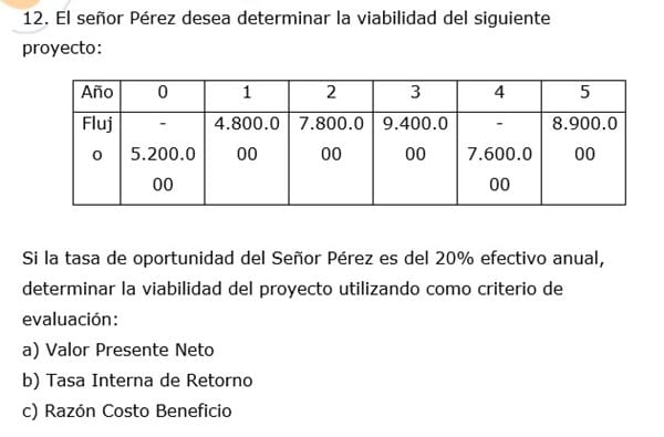 . El señor Pérez desea determinar la viabilidad del siguiente proyecto: