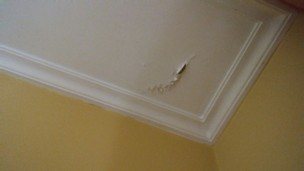Tenemos un agujero en el parqué de la guardilla de casa, debido a que durante mucho tiempo el cargador (enchufado) de un portátil estuvo posado sobre esa zona. El problema es que hemos descubierto que en la planta inferior a la guardilla se ha levantado la pintura y tiene un pequeño hueco. Cuando sacamos el cargador la madera del parqué quedo de otro color pero ahora se fue carcomiendo y parece como si traspasara la placa de hormigón para llegar a la planta inferior. Suponiendo que sea de algún líquido que perdió el cargador, ¿sabe alguien como poder reparar esto?. Os adjunto las fotos del agujero en la guardilla y en el piso inferior. Muchas gracias por vuestra ayuda.