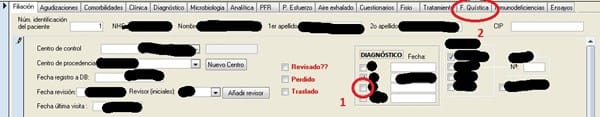 Tengo esta BBDD distribuida en pestañas (Filiación, Agudizaciones,...) y me gustaría que en el formulario principal (el de la vista actual, Filiación), al activar con tick (VERDADERO) la opción marcada en rojo núm 1 se me activara la pestaña (o subformulario) marcada en rojo núm 2 con sus consecuentes opciones y botones dentro de ese subformulario.