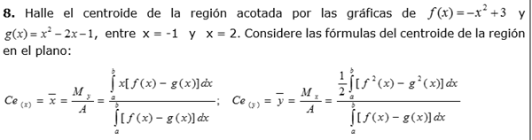 Halle el centroide de la región acotada por las gráficas de y , entre x = -1 y x = 2. Considere las fórmulas del cent