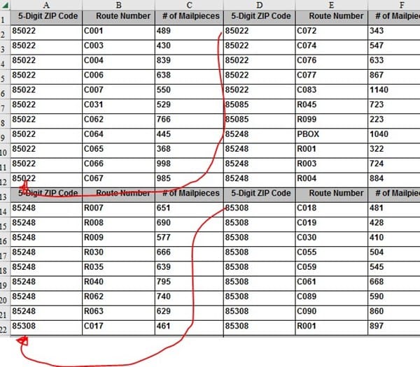 En este ejemplo, ZipCode 85022 esta en la columna A y continúan los datos en la columna DE, y necesito es ponerlos todos los 85022 uno debajos del otro quedando solo 3 columnas en la table Zip Code, route and #mailpieces. La cantidad de filas entre los encabezados es variable.
