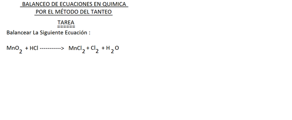 Empezamos por el manganeso por que es una molécula de 2 tipos de átomo, hay 2 y implica a otras 2 moléculas con átomos de la misma O y Cl (H2O y HCl)