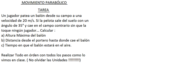 $$\begin{align}&x(t) = v_{x0} t\\&v_x(t) = v_{x0} \text{El movimiento en el eje X no tiene aceleración}\\&y(t) =v_{y0} t - \frac{1}2 g t^2\\&v_y(t) = v_{y0} - g t\\&Además...\\&v_{x0} = v_0 \cos(35°) = 20 \cdot 0.819 = 16.38m/s\\&v_{y0} = v_0 sen(35°) = 20 \cdot 0.574 = 11.47m/s\\&\text{Remplazando los datos por los valores conocidos...}\\&x(t) = 16.38 \cdot t\\&v_x(t) = 16.38\\&y(t) =11.47 t - 4.9 t^2\\&v_y(t) = 11.47 - 9.8 t\\&\text{a) Altura máxima del balón (será cuando la velocidad vertical sea 0)}\\&v_y(t) =0= 11.47 - 9.8 t \to t = \frac{11.47}{9.8}=1.17s\\&\text{y la altura la vemos con }y(t)\\&y(1.17) = 11.47 \cdot 1.17 - 4.9 \cdot 1.17^2 = 6.71m\\&\text{b) Distancia hasta donde cae el balón (hay varias formas, usaré una cualquiera)}\\&\text{Primero veo cuanto tiempo tarda en llegar al suelo (será cuando y(t)=0)}\\&y(t)=0 =11.47 t - 4.9 t^2\\&t_1 = 0 \text{Solución trivial}\\&t_2 = \frac{11.47}{4.9}=2.34s\\&\text{La distancia será x(t)}\\&x(2.34) = 16.38 \cdot 2.34 = 38.33m\\&\text{Tiempo en que el balón estará en el aire (lo calculamos antes, es 2.34s)}\end{align}$$No agregué las unidades de medida para no complicar los cálculos, pero tu deberías hacerlo. Recuerda que las distancias las medimos en 'm', el tiempo en 's', la velocidad en 'm/s' y la aceleración en 'm/s^2'
