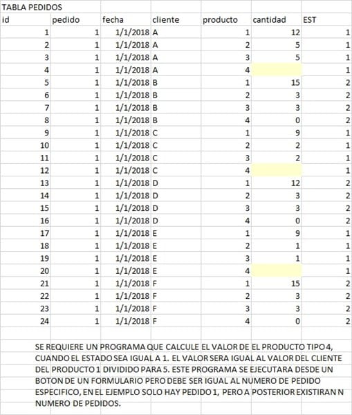 Se requiere un programa que calcule el valor de el producto tipo 4, cuando el estado sea igual a 1. El valor sera igual al valor del cliente del producto 1 dividido para 5. Este programa se ejecutara desde un botón de un formulario pero debe ser igual al numero de pedido especifico, en el ejemplo solo hay pedido 1, pero a posterior existirán n numero de pedidos. Gracias