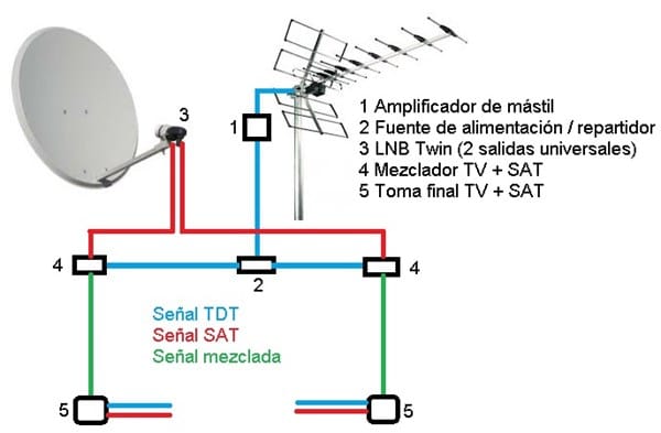 Dos casas contiguas en las que instalamos satélite y tdt. Reparto la tdt en dos líneas que van a un mezclador de señal con paso de corriente. De la parabólica saco dos líneas de un libro doble y las conecto a cada mezclador. La señal mezclada baja de forma independiente a cada vivienda y separo la señal con una toma sat tv. La casa 1 solo utiliza el satélite y se ve correcto todo y en la casa 2 utiliza satélite y tdt y ha estado funcionando bien hasta hace poco hasta que la señal satélite se corta sin saber por qué. He probado a cambiar los mezcladores y tomas separadoras de una casa a la otra y pero sigue fallando.
