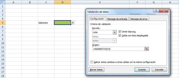 Si en la celda C5 coloco "insumos", que la celda D5 me muestre la lista desplegable llamada "insumos", pero si en C5 coloco "labores" que la celda D5 me muestre la lista desplegable "labores"