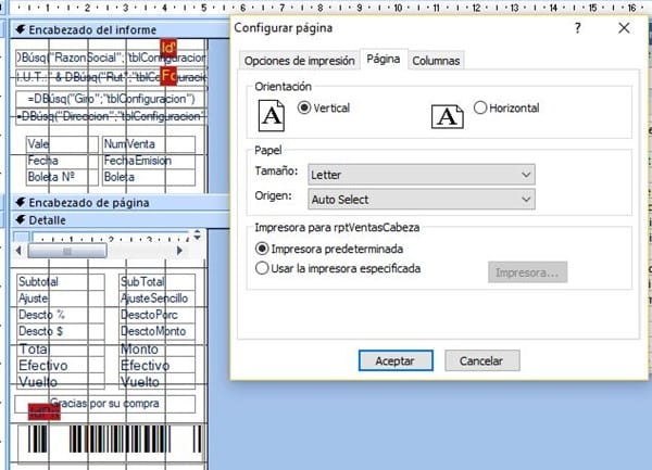 En Access 2007 (Si, es antiguo, pero es el que tiene el cliente) tengo creado un report para imprimir un vale de ventas. Todo OK, sólo que al configurar página indico que se imprima en la "impresora especificada" (Impresora para vales)