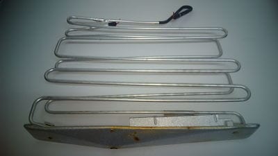 Pedida la resistencia por eBay a Lituania en 9 días la entregaron en puerta. Medida 222 ohmios. A la nueva le hemos de cortar los dos cables que trae y aprovechar los de la vieja con sus conectores que hemos dejado funcionando en la nevera, aprovecharemos también la bandeja inferior de deshielo. Es empotrarla en el serpentín, conectar y cerrar... media hora con los ojos cerrados. POWER ON y a esperar a que la nevera pare y reinicie sola... ¡¡¡TODO PERFECTO!!!
