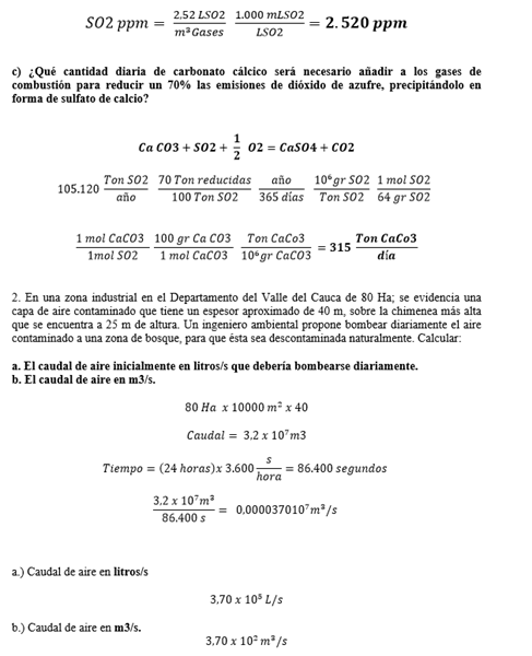 c) ¿Qué cantidad diaria de carbonato cálcico será necesario añadir a los gases de combustión para reducir un 70% las emisiones de dióxido de azufre, precipitándolo en forma de sulfato de calcio? 2. En una zona industrial en el Departamento del Valle del Cauca de 80 Ha; se evidencia una capa de aire contaminado que tiene un espesor aproximado de 40 m, sobre la chimenea más alta que se encuentra a 25 m de altura. Un ingeniero ambiental propone bombear diariamente el aire contaminado a una zona de bosque, para que ésta sea descontaminada naturalmente. Calcular: a. El caudal de aire inicialmente en litros/s que debería bombearse diariamente. b. El caudal de aire en m3/s.