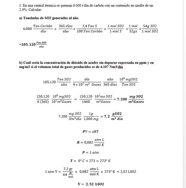 1. En una central térmica se queman 6.000 t/día de carbón con un contenido en azufre de un 2,4%. Calcular:
