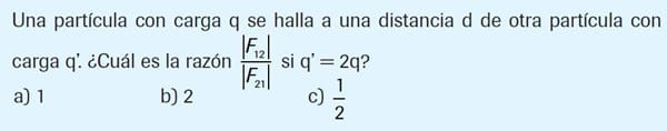 Problema de la Ley de Coulomb. Electricidad y magnetismo. Una partícula con carga q se halla a una distancia d de otra partícula con carga q’ . ¿Cuál es la razón | F12 | / | F21 | si q' = 2q ?