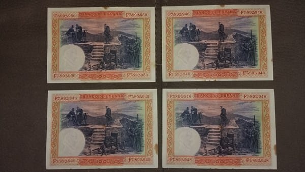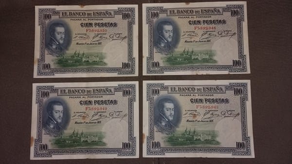 Tengo 3 billetes de 100 pesetas 1925 correlativos, pero en MBC y circulados.
