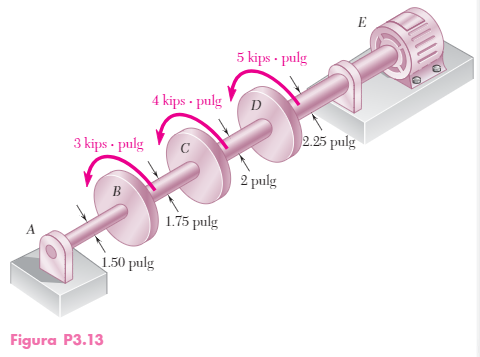 Bajo condiciones normales de operación, el motor eléctrico ejerce un par de torsión de 12 kips. Pulg en E. Si se sabe que cada eje es sólido, determine el máximo esfuerzo cortante a) en el eje BC, b) en el eje CD, c) en el eje DE.