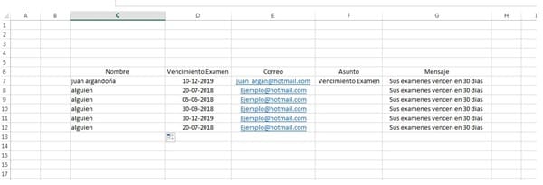 Necesito que mediante excel, se envíe un correo a cada usuario, cuando se cumpla una condición, tengo una planilla con Nombre, Vencimiento Examen, Correo, Asunto, Mensaje, cuando la fecha de vencimiento de examen, comparada con la fecha actual, sea igual a 30 días, se envíe un correo avisando de esto.