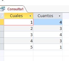 Soy profesor y tengo que llevar una planilla donde se lleva el registro de notas obtenidas por materia de cada estudiante, ya tengo la tabla con los datos numéricos en columnas por materia, el asunto es que debo llevar un reporte de cuantas notas por un criterio de evaluación se llevan, es decir por ejemplo en la materia español aparecen 25 registros de diferente promedios, porque son 25 estudiantes, allí aparecen promedios desde 1.0 hasta 5.0, diversos, quiero contar cuantos 3.0, cuantos 4.0, cuantos 5.0, cuantos 1.0 y cuantos 2.0 hay en cada columna por materia, cierto esta que las notas no todas son exactas aparecen 3.5,3.4,3.3, 2.8,2.3,1.8 y así sucesivamente, quiero contar cuantos hay de cada una en una sola columna utilizando una fórmula en access he intentado y no me sale el conteo.