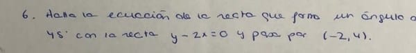 y=2x; está a 45° de la anterior (puede ser +45° o -45°) y pasa por (-2; 4).