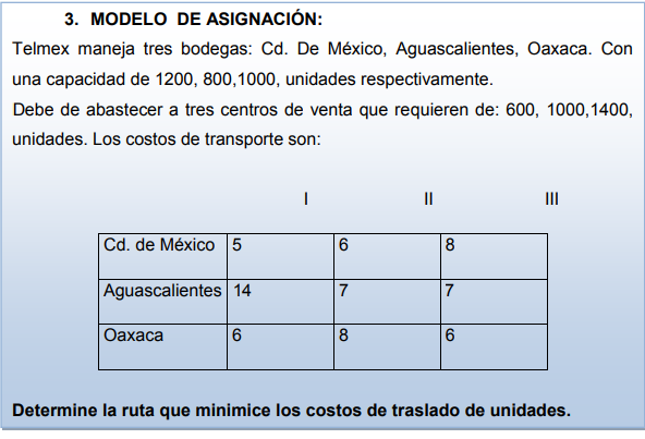 Telmex maneja tres bodegas: Cd. De México, Aguas calientes, Oaxaca. Con una capacidad de 1200, 800,1000, unidades respectivamente. Debe de abastecer a tres centros de venta que requieren de: 600, 1000,1400, unidades.