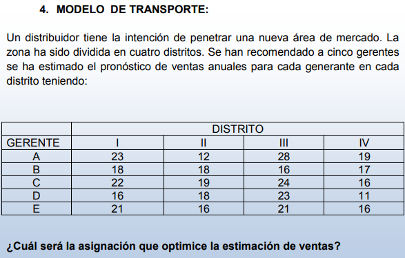 Un distribuidor tiene la intención de penetrar una nueva área de mercado. La zona ha sido dividida en cuatro distritos. Se han recomendado a cinco gerentes se ha estimado el pronóstico de ventas anuales para cada generante en cada distrito teniendo