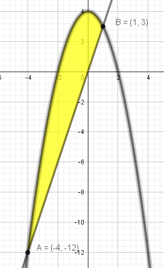 $$\begin{align}&y=4-x^2\\&y=3x\\&igualando\\&4-x^2=3x\\&x^2+3x-4=0\\&\\&x_1=-4\\&x_2=1\\&\text{como la base es el plano XY}=> z=0\\&\text{y el techo el plano z=x+4}\\&\text{Tenemos que los límites de integración son}\\&0\leq z \leq x+4\\&\\&3x \leq y \leq4-x^2\\&\\&-4 \leq x \leq 1\\&\\&\text{Luego el Volumen:}\\&\\&V=\int_{-4}^1 \int_{3x}^{4-x^2} \int_0^{x+4}dz\ dy \ dx=\\&\\&\int_{-4}^1 \int_{3x}^{4-x^2} \Bigg[ \int_0^{x+4}dz\Bigg] dy dx=\\&\\&\int_{-4}^1 \int_{3x}^{4-x^2} \Big[z\Big]_0^{x+4}\ \ dydx=\\&\\&\int_{-4}^1 \Bigg[\int_{3x}^{4-x^2} (x+4)dy\Bigg]dx=\\&\\&\int_{-4}^1 \Bigg[xy+4y \Bigg]_{3x}^{4-x^2}dx=\\&\\&\int_{-4}^1 \Bigg[x(4-x^2)+4(4-x^2)-(3x^2+12x)\Bigg]dx=\\&\\&\int_{-4}^1 \Big(4x-x^3+16-4x^2-3x^2-12x \Big) dx=\\&\\&\int_{-4}^1 \Big( -x^3-7x^2-8x+16 \Big) dx=\\&\\&\frac {625}{12} \ \ \ u^3\\&\\&\\&\\&\\&\\&\end{align}$$Saludos