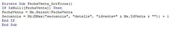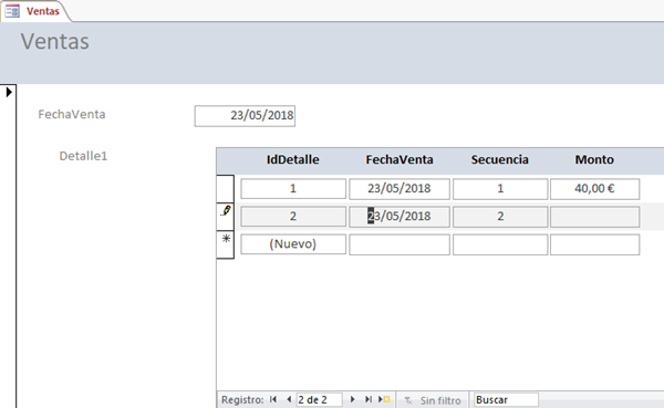 Tengo un formulario llamado buscar que posee un dos campos id:autonumérico y fecha:de tipo fecha de la tabla buscar a su vez posee un sub formulario de una tabla llamada venta con los campos id, de tipo autonumérico, secuencia de tipo numero, y monto de tipo numero
