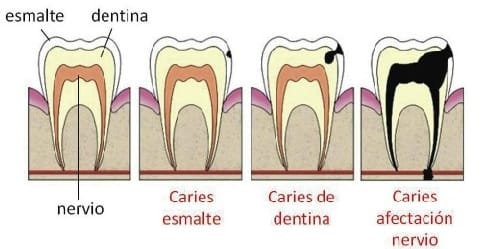 1. El esmalte: es la capa externa de color blanco la cual es visible al sonreír, esta capa tiene la propiedad de ser dura como el vidrio y por ende no presenta terminaciones nerviosas, la cual cumple la función de un escudo; por ende cuando la caries está ubicada a este nivel el paciente no presenta ningún dolor pero es de mucha importancia el poder curarlo con composite cuanto antes ya que de lo contrario continuará cavitando y llegará a la segunda capa (dentina).
