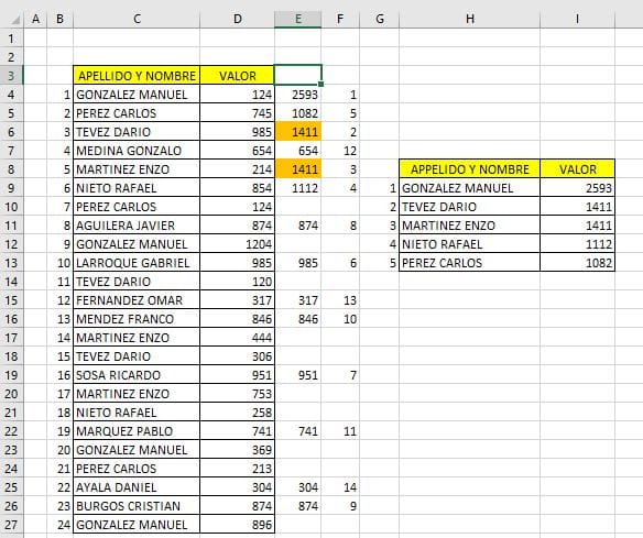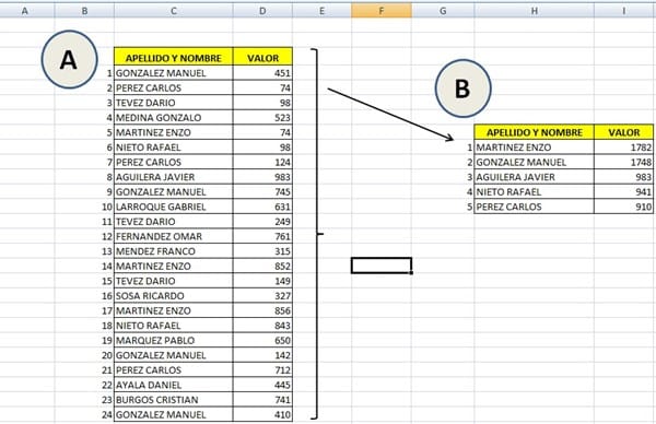 Quisiera saber si hay alguna función de que de un rango de datos (nombre y valores) me de por respuesta quienes son los cinco máximo con respecto a los valores y que vaya variando según se vayan cargando datos. Paso imagen con ejemplo.