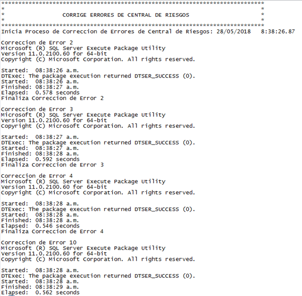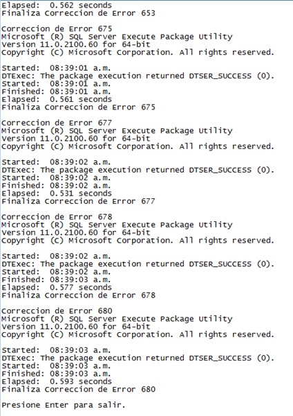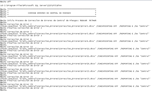 @echo off cd c:\Programa Files\Microsoft SQL Server\110\DTS\Binn @echo Correccion de Error 2 DTExec.exe/FILE "D:\ETL_Central\Correccion_Errores\Error2.dtsx" /CHECKPOINTING OFF /REPORTING E /De "Central" @echo Finaliza Correccion de Error 2