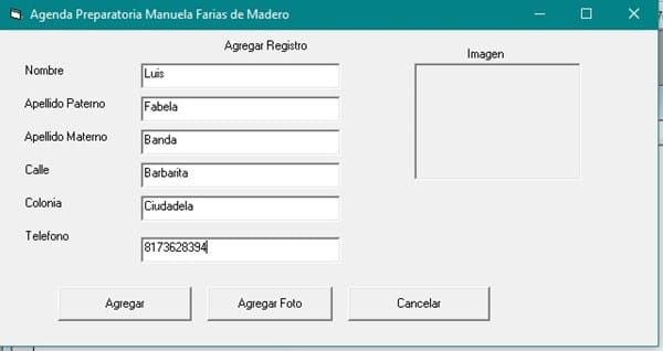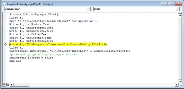 Private Sub cmdAgregar_Click() Close #1 Open "C:\Proyecto\Agenda\Agenda.txt" For Append As 1 Write #1, txtNombre.Text Write #1, txtApaterno.Text Write #1, txtAmaterno.Text Write #1, txtCalle.Text Write #1, txtColonia.Text Write #1, txtTelefono.Text Write #1, "C:\Proyecto\Imagenes\" & CommonDialog.FileTitle Close #1 SavePicture imgPersona, "C:\Proyecto\Imagenes\" & CommonDialog.FileTitle 'poner codigo para limpiar cajas de texto cmdAgregar.Enabled = False End Sub