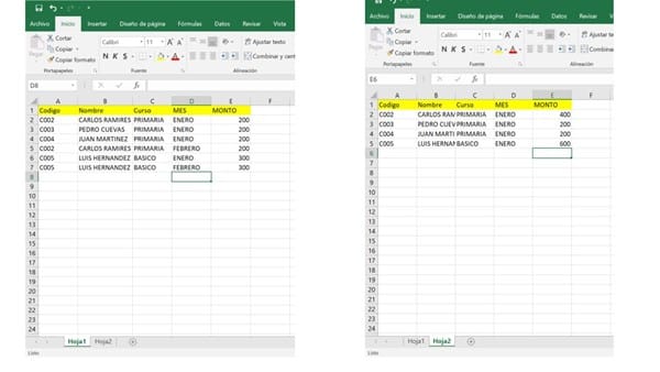 Me gustaría y me ayudaran con un formulario en el cual ingreso los datos solicitados Código, Nombre, Curso, Mes, Monto. Lo que necesito es que al momento de dar click también me acumele los datos en hoja2 ej.: