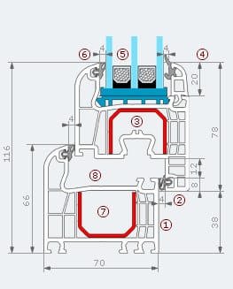• El diseño de las cinco cámaras aseguran una protección térmica y acústica óptima, así como una perfecta estabilidad gracias a la aplicación del sistema de cámaras dentro del perfil, permitiendo un sellado y aislamiento térmico de los paneles de las ventanas, lo que proporciona una considerable reducción de pérdida de energía.
