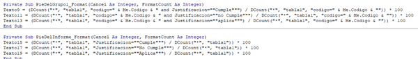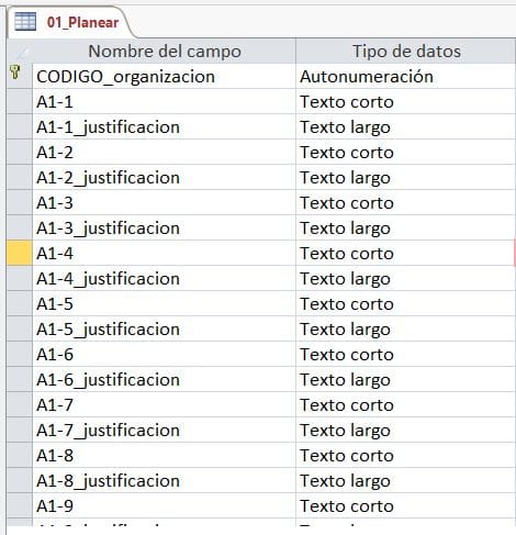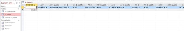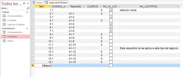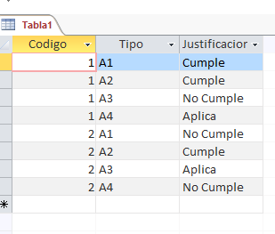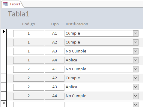 Hice e una tabla en Access 2016 donde las columnas son algo así como los ítem de una lista de verificación y escogí como tipo de datos "asistente para búsqueda" donde en el formulario se escoge entre: cumple, no aplica y justifica la no aplicación del requisito; pero como soy nueva usando Access, me dí cuenta que la consulta se hace por campos y no por registros, es decir, la consulta no lo hace por filas. Entonces, no sé cómo acomodar la tabla o cómo crear la consulta, de tal manera que, pueda saber de una misma referencia o código que esté cumpliendo con la lista de requisitos o ítems y luego hacer un informe en donde me indique que tanto por ciento de esa referencia o código, cumple con los requisitos. Y si es posible me gustaría que la consulta y el informe pudieran agrupar determinaros ítems o requisitos y conocer el tanto por ciento de cumplimiento por grupo.