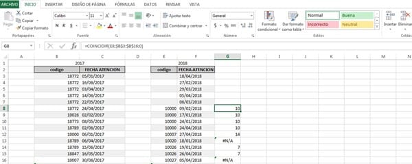 Tengo 4 columnas con datos, en 2 hay códigos y en las otras 2 hay fechas, lo que necesito es buscar código