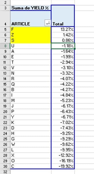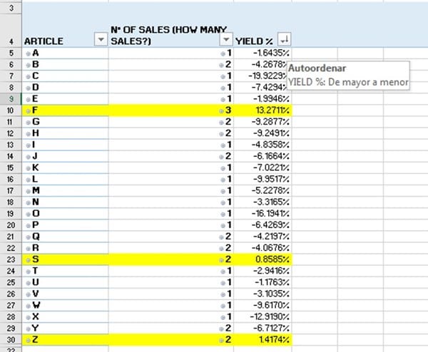 Requiero por favor su apoyo con lo siguiente: He construido una tabla dinámica de 3 columnas: "ARTICLE", "Nº OF SALES (HOW MANY SALES?)", "YIELD %", necesitando ordenar de mayor a menor a esta última columna (ver imagen 1, en amarillo las líneas que deberían quedar al principio al ordenar de mayor a menor). El problema es que no he logrado que funcione correctamente. He tratado sin éxito algunas variantes excluyendo, moviendo columnas, usando el comando ordenar de los filtros y del menú Datos (ver imágenes 2 y 3). Sólo he conseguido el resultado esperado cuando excluyo Nº OF SALES (¿how many sales?) Y se coloca YIELD % en la sección Valores del menú de campos de la tabla (ver imagen 4) pero necesito las 3 columnas indicadas al principio. Buscando en internet, leí artículos que hablan de que la configuración regional debe ser la correcta por lo cual procedí a cambiarla a Inglés Estados Unidos en el Panel de Control (ver imagen 5) y a punto para decimales y coma para miles en Excel (ver imagen 6), pero sin suerte (uso esta configuración porque es la de los datos originales). Uso Excel 2016, windows 7.