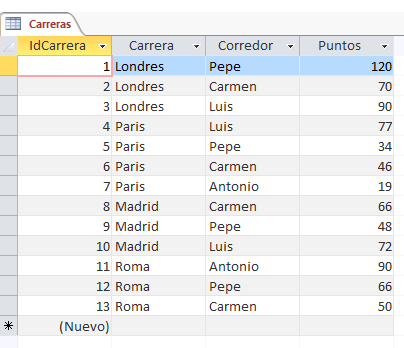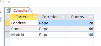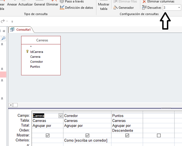 Tengo una tabla llamada RESULTADOS, en dicha tabla hay tres campos: CARRERAS, CORREDOR Y PUNTOS. Si por ejemplo hay 10 carreras en toda la temporada y yo quiero sumar sólo las 7 mejores carreras de cada corredor (las de mayor puntuación). ¿Es posible hacer esto en access? ¿Cómo? Gracias por las respuestas. (Imagino que sólo es posible con código: Lo ideal para mi caso sería poder poner ese resultado en un cuadro de texto de un informe llamado "Total").
