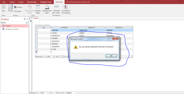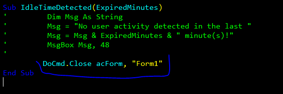 Hasta aquí solo te mandara un mensaje indicando que el formulario tuvo 1 minuto de inactividad, aquí debes de poner el Docmd. Close, o el código que quieras que haga al cumplirse 1 minuto de inactividad.